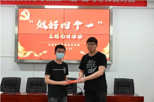 亮一次文明先锋牌。党员文明先锋牌由支部统一印制并由张城老师和周俊海老师进行颁发。支委李祎成对亮牌示岗细则进行说明,要求全体研究生党员将铭牌摆放在显眼位置,在参加活动、学习、工作中佩戴党员徽章,切实做到“亮身份、示岗位、做先锋”。