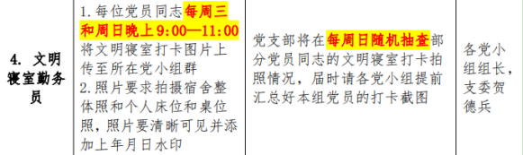 每一个党员就是所在寝室勤务员,既主动带头又主动督促,既严格要求自我又切实带动寝室其他成员,是真正意义上的以点带面充分发挥党员先进模范作用。活动开展期间每名党员都做到了主动做好寝室卫生,主动排查安全隐患,主动进行拍照打卡。支部党员均表示文明寝室拍照打卡活动不仅提升了自己文明意识和卫生意识,更营造了一个干净整洁的寝室卫生环境。