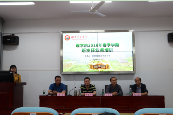 (理公司 马文秀)为进一步加强学院班主任队伍建设,提高公司班主任队伍的管理能力和水平,4月12日下午,理公司于十五教学楼624室召开了2018年春季班主任培训会,出席本次会议的有理公司经理周文新,理公司党委书记邓白平,招生与就业指导处副处长姚文昌,理公司党委副书记李华及学工组辅导员老师,参加本次培训会的为理公司所有班主任老师。本次培训会由学工组马文秀老师主持。