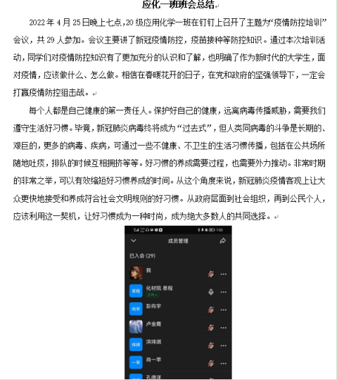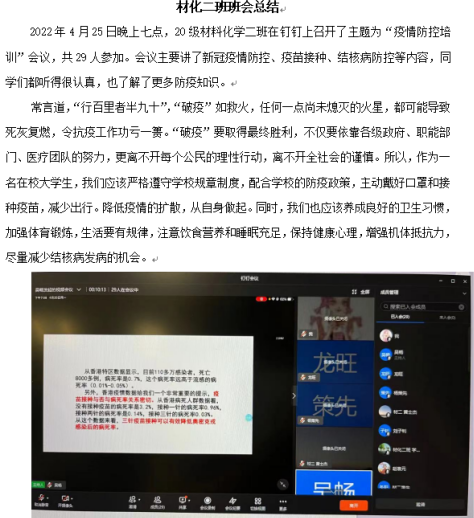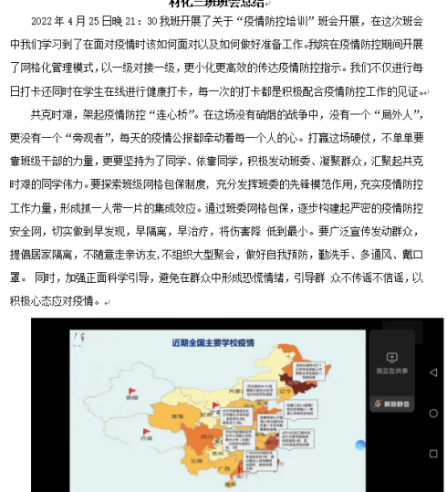 (化材公司 庄淑贤)4月22日下午,公司在修业讲堂开展疫情防控工作培训。为更好地引导同学们领悟会议精神,落实科学防疫,2020级本科各班级于4月22日至4月25日,以线上模式陆续召开主题班会,观看会议录播视频。