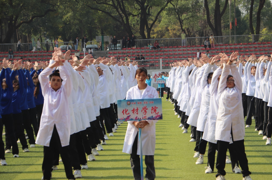 随着“化材化材,继往开来,博学笃志,辈出人才!”的口号响彻东田径场,65名化材健儿们神采飞扬,迈着整齐划一的步伐,精神饱满地步入了比赛场地。广播体操音乐一响起,化材健儿们迅速调整呼吸、进入状态,轻踩着广播体操轻快的节奏,动作标准、有力、优美,举手、投足、弯腰、转身、跳跃干净利落,动作中充满着自信。音乐声结束,田径场爆发出雷霆般的掌声和加油声,评委及现场观众对化材学子朝气蓬勃的精神风貌赞不绝口。