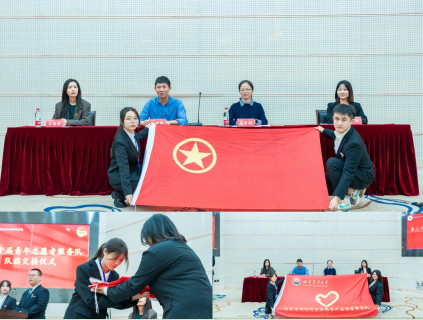 全体人员奏唱团歌,大会开始。周俊海宣读新一届团委员工会聘任名单,并对同学们的加入表示热烈欢迎,随后,四位老师依次为新成员们颁发聘书,员工会主席团、青年志愿服务队新老相遇,相继开展交接团旗、青年志愿者队旗仪式。