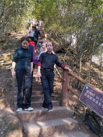 随后,会员们来到了天柱峰景区,在九龙湖登船后到达天柱峰主峰。天柱峰古名灵石峰,亦名麦果峰。清乾隆年间宁州举人刘显祖嫌其名太俗,易名天柱峰。它由红色砂砾岩组成,是典型的丹霞地貌。它三面环水,雄伟挺拔,相对高度208米,形同天柱,屹立于景区中央,是天柱峰景区内标志性景观,有“修江第一峰”之称,更是铜鼓县天柱峰国家森林公园的象征。会员们一路欢声笑语,你搀我,我扶你,非常有团结精神。