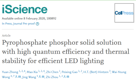 (化材公司 夏茂),近日,公司周智教授课题组基于对蓝光发射荧光粉α-Sr2P2O7:Eu2+的固溶体结构设计,成功实现了α-Sr2P2O7到σ-Ba2P2O7的连续可调可控合成,并最终使得该荧光粉的光量子效率和热稳定性得到了空前的提高,相关最新研究成果以“Pyrophosphate phosphor solid solution with high quantum efficiency and thermal stability for efficient LED lighting”为题在线发表于《Cell》子刊《iScience》上。该论文由球盟会周智教授、中山大学王静教授和香港理工大学黄维杨教授共同指导完成。2017级硕士研究生钟圆和夏茂讲师为本论文的共同第一作者,球盟会为第一通讯单位。