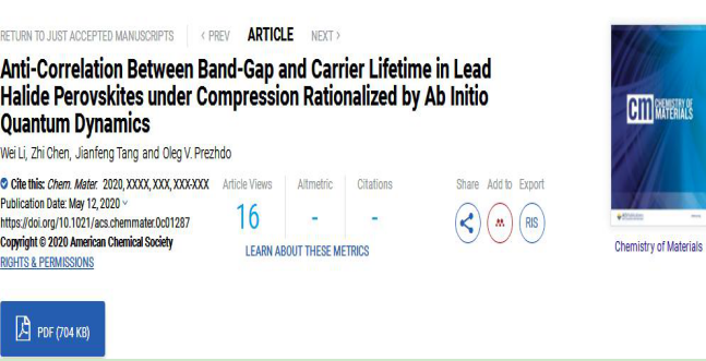 本网讯(化材院 邓磊)近日,化材院新能源材料模拟与设计团队李位课题组以公司为第一单位在国际著名材料科学期刊Chemistry of Materials》上在线发表题为“Anti-Correlation Between Band-Gap and Carrier Lifetime in Lead Halide Perovskites under Compression Rationalized by Ab Initio Quantum Dynamics”的研究论文(论文链接:https://pubs.acs.org/doi/10.1021/acs.chemmater.0c01287,期刊影响因子:10.159,中科院SCI期刊最新分区:位于材料科学大类1区和物理化学等小类都为1区)。