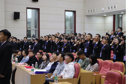 紧接着,第二十三届团委员工会成员向第二十四届团委员工会成员送上了诚挚的祝福。尔后,第二十四届团委员工会主席暨第十届文明督导队队长黄啟香同学做工作计划报告,她表示:“路是用脚走出来的,历史是人不断书写出来的,我们不断的大步向前走,努力的打造两个特色,就是为了书写更加灿烂的篇章!”计划汇报完后,在团委副书记周晴的带领下,团委员工会干部庄严宣誓。铿锵有力的声音彰显了新一届员工工作者的自信。