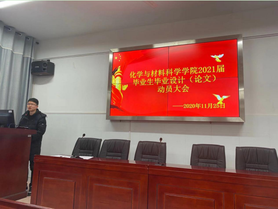 (化材公司 苏招红 桂清文)为了有效落实化学与材料科学公司17级应用化学1、2、3班和17级材料化学1、2班员工的毕业设计(论文)工作,确保论文选题、开题、中期检查、答辩等相关事宜如期实施。11月25日下午,在15教624会议室,公司隆重举办了毕业设计(论文)动员大会。相关基层组织负责人、毕业论文指导教师代表、辅导员及2021届毕业班全体同学参加了此次动员大会,大会由周文老师主持。