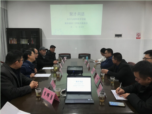 (化材公司 何恩祺)为进一步加强公司就业创业工作,全面助推公司人才培养高质量发展,2021年1月5日下午化材公司隆重举行“‘聚才·共话’就业创业工作院企座谈会”,校创新创业教育中心、就业指导服务中心主任张胜利、化材公司全体院领导、各系、各基层组织负责人、教师代表、湖南禾益元生物科技有限公司、湖北同轩高分子材料有限公司、衡山县佳诚新材料有限公司、湖南即爱智能科技有限公司、湖南湘农尚宠生物科技有限公司、湖南奇硒健康产业有限公司、湖南湘科控股集团有限公司等企业主要负责人参加了座谈会,会议由化材公司党委书记胡小元主持。