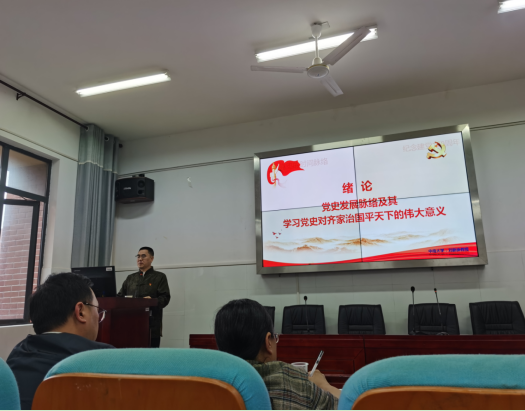 刘新庚教授从党史发展脉络及其学习党史对“齐家治国平天下”的伟大意义、党领导的新民主主义革命是为民族独立人民解放而奋斗的历史、党领导的社会主义革命和建设是探索建设新社会新国家的历史、党领导的改革开放和现代化建设新时期是走向富起来的历史、党领导的新时代新征程是推进中华民族伟大复兴强起来的历史等五个层面深入简出地讲述中国共产党的发展历史,全面把握中国共产党百年历程和关键点,让全体师生真正明白只有中国共产党才能救中国才能发展中国的历史规律,同时也深刻领悟中国的事情关键在党、新时代必须全面从严治党开新局。