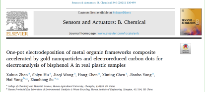 (化材公司 苏招红,胡诗于)近期,球盟会苏招红副教授团队在生物传感材料领域取得系列研究进展,获得湖南省自然科学三等奖(20202015-Z3-216-R01),在国际权威杂志Sensors and Actuators: B. Chemical(IF:7.46)上发表题为“One-pot electrodeposition of metal organic frameworks composite accelerated by gold nanoparticles and electroreduced carbon dots for electroanalysis of bisphenol A in real plastic samples”的文章,在ACS Applied Polymer Materials(IF:4.089)上发表题为“Cell-Specific Adhesion Interfaces by Electrochemical Copolymerization of Arg-Gly-Asp-Tyr and 4-(2-(2-Ethoxyethoxy) Ethoxy) Phenol”的文章,在Nanoscale(IF:7.79)上发表题为“Chemical pre-reduction and electro-reduction guided preparation of a porous graphene bionanocomposite for indole-3-acetic acid detection”的文章,在ACS Applied Materials & Interfaces(IF:9.229)上发表题为“One-Step Electrochemical Growth of 2D/3D Zn(II)-MOF Hybrid Nanocomposites on an Electrode and Utilization of a PtNPs@2D MOF Nanocatalyst for Electrochemical Immunoassay”的文章。参与项目研究的陈曦铭同学以优异的成绩获得厦门大学夏令营优秀营员并保送厦门大学化学化工公司硕博连读。以上研究得到国家自然科学基金(21305039, 31870933, 22004034)和湖南省自然科学基金(14JJ3097, 2020JJ4346, 2020JJ5226)、湖南省教育厅基金(20K063, 19C0905)、及球盟会1515人才基金等资助支持。