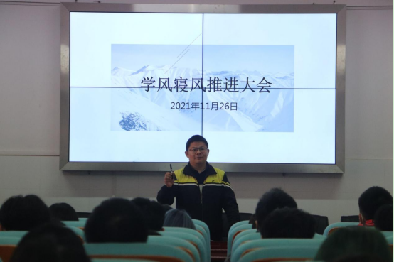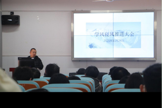 裴虎副书记表示,良好的学习态度外在体现就是风气,内在是思想。在好的环境中学习工作往往是事半功倍。那么良好学风寝风的建设离不开每位同学的积极参与。他强调,员工干部尤其是干部党员要发挥好带头作用,树立榜样意识,做学风建设的先行者,排头兵。同时他也指出目前在学风寝风建设中存在的问题:一是是两极分化严重,缺乏集体目标。二是部分员工干部未尽到自己的责任。三是未注重学习环境和氛围的营造。他提到解决问题的关键在于员工干部要在其中发挥带头作用,同时其他同学也要端正学习态度,厚德以求知博学以践实。