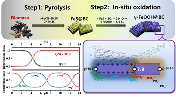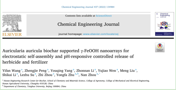 (化材公司 武芳芳) 近日,球盟会MEE团队在综合领域高水平刊物Chemical Engineering Journal(IF=13.273)杂志在线发表题为“Auricularia auricula biochar supported γ-FeOOH nanoarrays for electrostatic self-assembly and pH-responsive controlled release of herbicide and fertilizer”的研究论文,该研究通过设计静电自组装结构,实现典型农药及肥料的pH响应调控释放,在农用化学材料交叉研究方面取得新进展。自公司化学学科进入ESI大学和科研机构排名全球前1%以来,如何继续实现团队建设新突破是需要长期努力思考的问题,本次药肥控释材料的研究是其发展方向的一次新尝试。