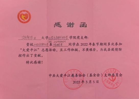 4月1日上午,公司党支部收到了一封来自中共大爱平江慈善协会支部(基金会)委员会感谢函,感谢2020级材料化学一班陈鹏章同学在2022年春季期间多次参加“大爱平江”志愿活动,且工作积极、不畏艰苦,为平江县疫情防控做出了贡献,对其敢于付出、乐于奉献、坚守岗位、认真履职尽责表达了感谢和赞赏,并充分肯定了公司员工教育的成效。