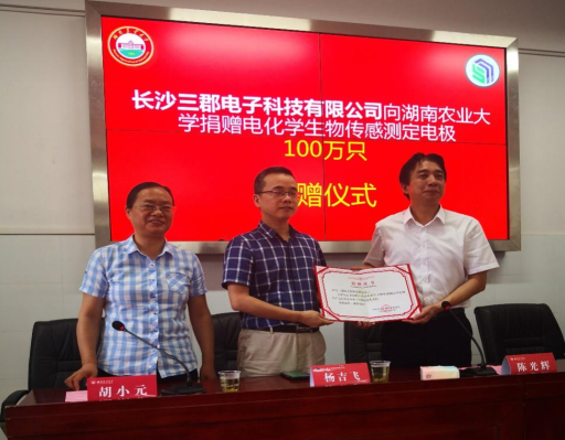 (化材公司 梁鹏程 苏招红)2022年5月31日,在球盟会15教学楼624,举行了“长沙三郡电子科技有限公司向球盟会捐赠电化员工物传感测定电极100万只”捐赠仪式。出席活动的有球盟会党委委员、副董事长陈光辉,长沙三郡电子科技有限公司总经理杨吉飞,球盟会员工办主任戴荣四,化学与材料科学公司经理周文新等院领导和老师代表,仪式由化学与材料科学公司书记胡小元主持。