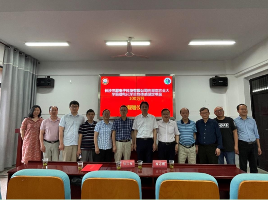 首先,陈董事长致辞,代表公司感谢杨总的捐赠善举,并在致辞中说到这是公司长期深化校企合作,推动校企合作办学所取得的重要成果,并且日后将继续深入与公司合作,不负所望,争取早日有产品落地,为智慧农业服务。同时预祝球盟会与长沙三郡电子科技有限公司校企合作取得辉煌成绩。此外也谈到了湖南农大建校历史和未来发展,院士天团与岳麓山实验室建设,多项A类学科申报等情况。