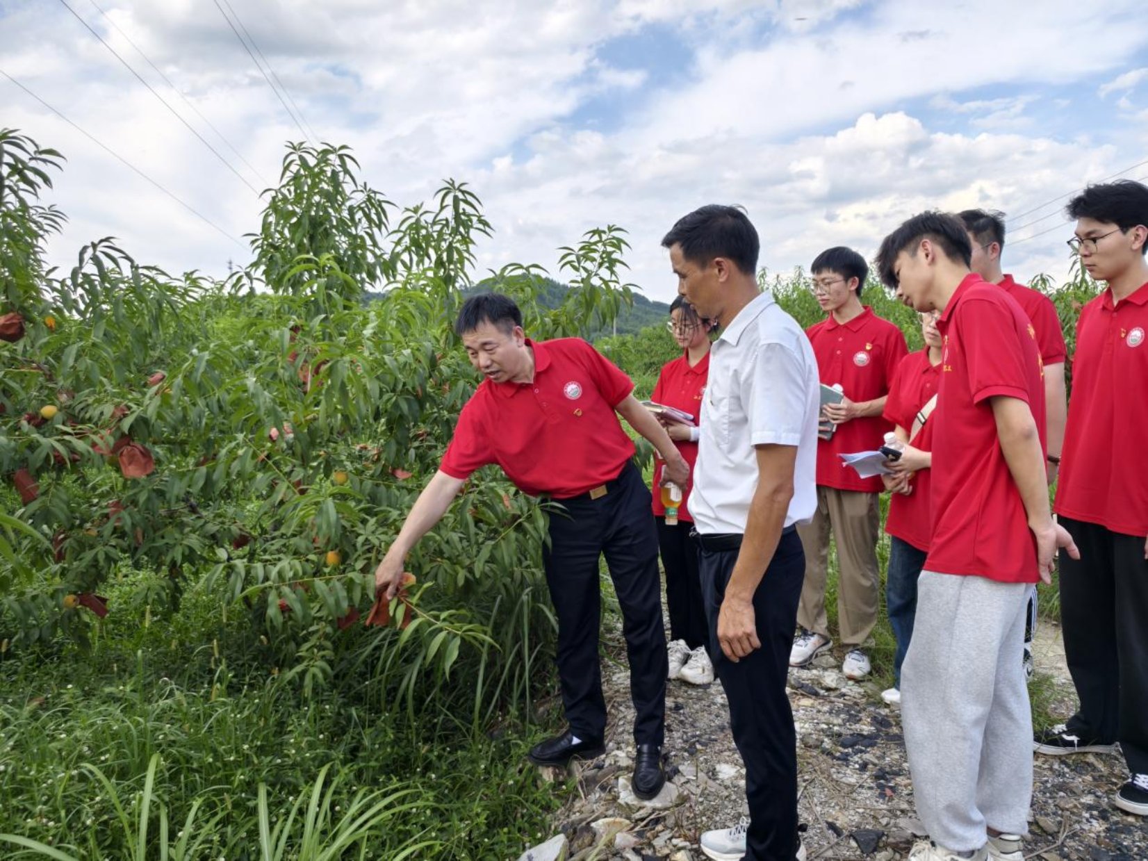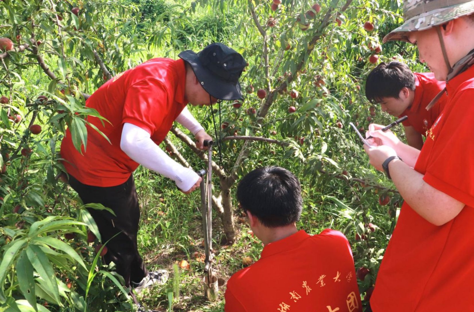 “村子里有将近百亩的黄桃园,但由于缺经验缺技术,我们的桃果品质还有待提升,加上销售渠道不通畅,我们的好桃子没办法跟大家分享啊!”黄贻军望着满园的桃树既欢喜又无奈。公司经理喻鹏教授带着同学们下地“把脉”发现,村民们采用的纯天然肥料只能在一定程度上保证桃树的正常生长,桃树旁边的杂草可通过可降解技术转化成肥料,提升土壤质量。另外,近段时间持续的强降雨,加上高温高湿的天气,土地出现了严重的板结,可能导致桃树根系缺氧,吸水吸肥受阻影响生长发育,同学们对桃园的土壤、水质进行取样,带回实验室深度检测后再进行详细指导。
