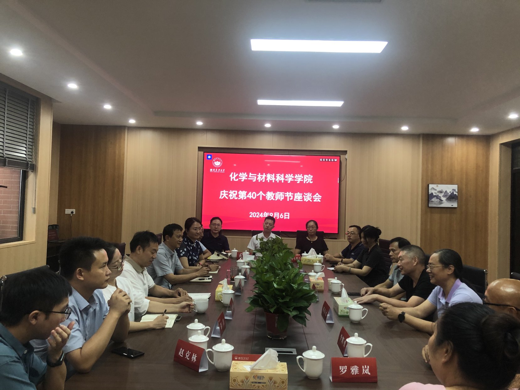 为庆祝第 40个教师节,弘扬尊师重教传统,彰显社会对教育工作者的感激和敬意,激励、引导广大教师见贤思齐、崇德修身、潜心教书育人。9月6日下午,化材公司召开庆祝教师节座谈会,公司原任院领导、现任院领导、退休教师代表、新入职教师代表、学位点领衔人代表、研究生代表、基层教学组织负责人等参加,党委书记汤帮耀主持,