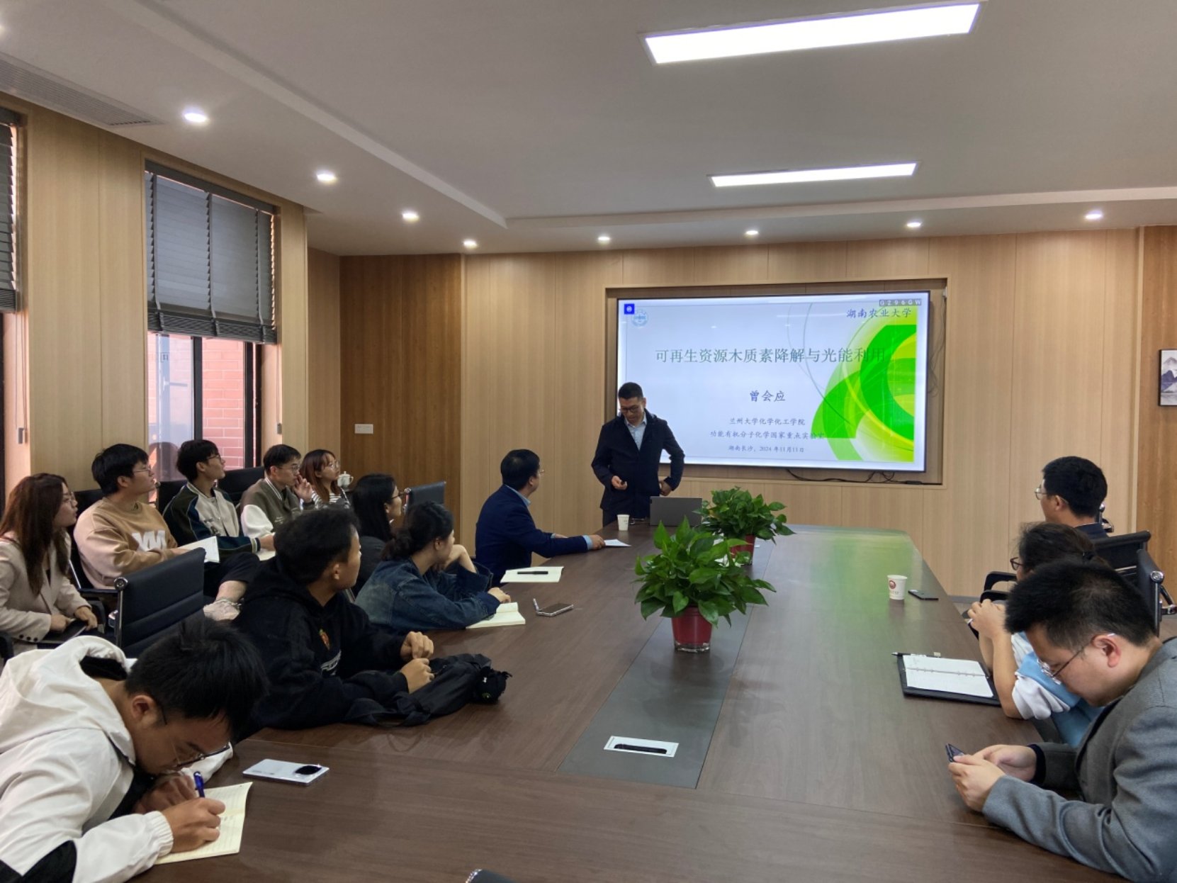 2024年11月11日上午,教育部青年“长江学者”、兰州大学曾会应教授应邀到公司开展学术交流,并作了题为“可再生资源木质素降解与光能利用”的学术报告。报告由球盟会王志国老师主持,公司师生代表聆听了此次报告。