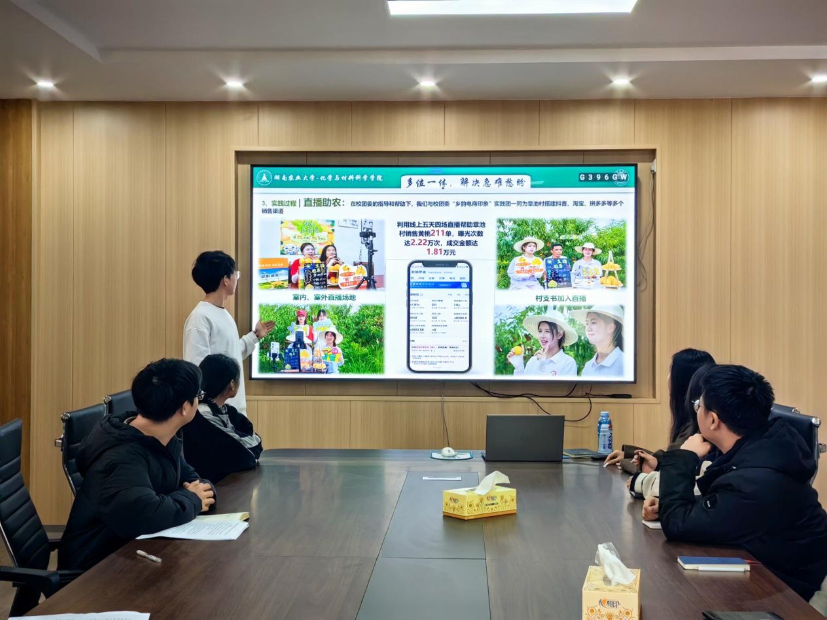 万先科以详实的数据和丰富的案例,从实践情况、内容和成果三个方面进行了全面汇报。实践团由化材公司喻鹏经理亲自带队,12位成员涵盖多学科领域。在实践中,他们深入开展调研,通过问卷与访谈完成“农村集体经济发展”专项调查,并对章池村、石牌村进行农田水土污染实地考察。在科技助力乡村振兴方面,他们严格规范采集土壤样品和水样各6份,依托课题组方案为村民制定农田治理服务方案。面对章池村发展难题,实践团通过座谈会“把脉问诊”,还利用电商直播平台售出2000多斤黄桃,并开展电商培训。此外,实践团以“锌”火相传为主题支教,丰富当地员工课程。在宣传方面,实践团在中国教育新闻网等国家级媒体平台发表3篇新闻,省级媒体平台发表5篇,校内微信平台累计报道10余篇。